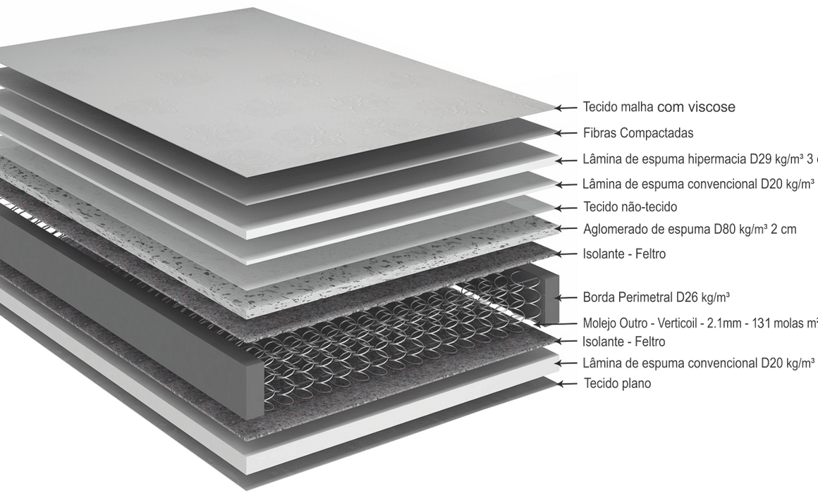 Colchão desenvolvido no sistema de molas verticoil, que tem como característica principal resistência e conforto.