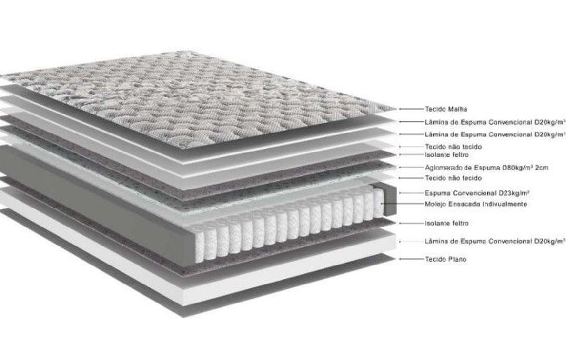 Descrição: Colchão de Molejo Ensacada Individualmente, Bitola 2.0. Tampo: Bordado Contínuo / Tecido Malha / Lâmina de Lâmina de Espuma Convencional D20 Kg/m³ x 2cm / Lâmina de Espuma Convencional D20 Kg/m³ x 1cm / Tecido não tecido. Isolante Feltro. Camadas de Conforto: Aglomerado de Espuma D80 Kg/m³ x 2cm / Isolante feltro / Lâmina de Espuma Convencional D20 Kg/m³ x 8cm