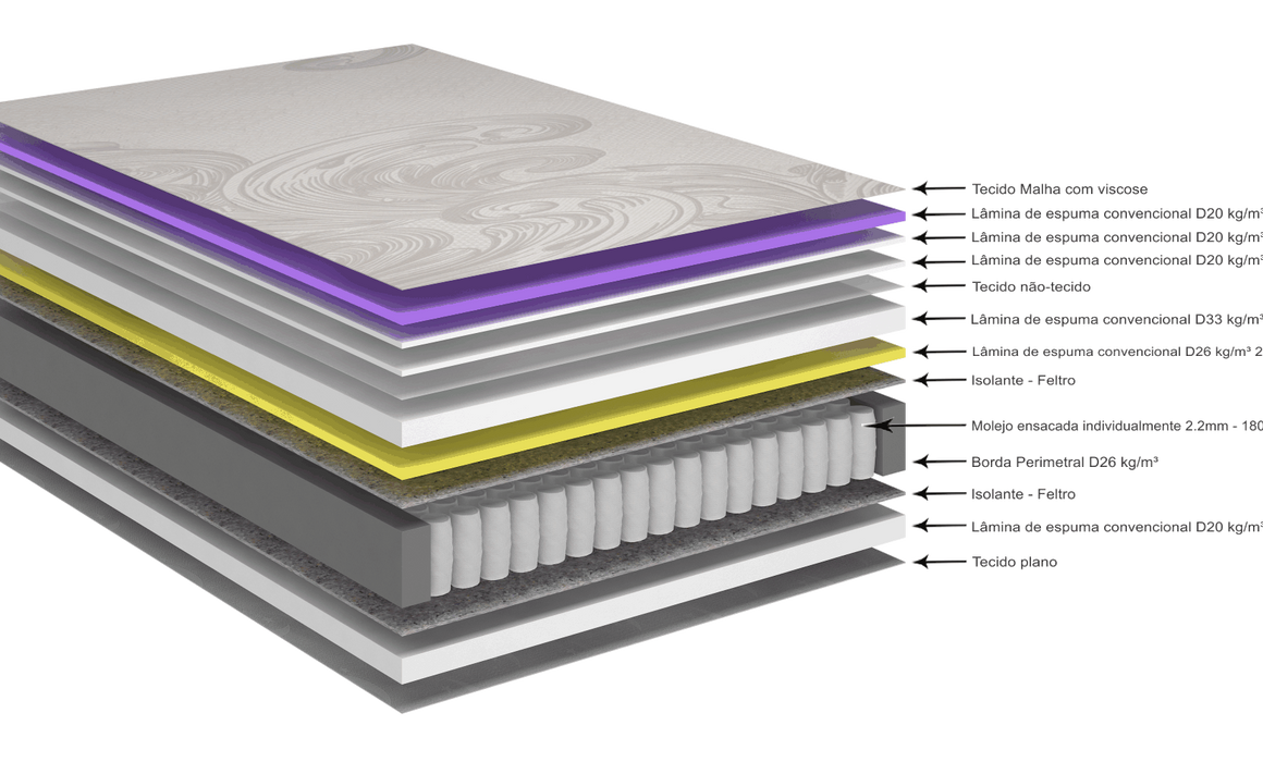 Excelente custo benefício com um produto desenvolvido na mola ensacada especial, a PHP que oferece maior resistência, firmeza para biótipos de até 150 kg.